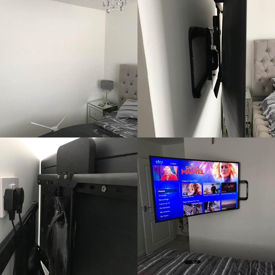 Different installation types: one features a hidden Sky Q box (cables hidden to customer’s cupboard) and the other was fitted using a full motion bracket. But both have the same professional standard.